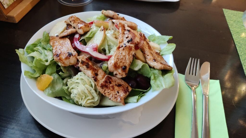 In dem Salat war fast alles drin: Verschiedene grüne Salate, eingelegtes Gemüse, Früchte, Kartoffelsalat, Kraut,... eine super Kombination! 😃