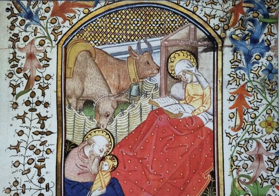 Eine ungewöhnliche Krippenszene aus dem 'Stundenbuch von Besançon' (15. Jahrhundert). Die #HeiligenDreiKönige haben Bücher gebracht.