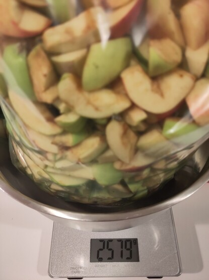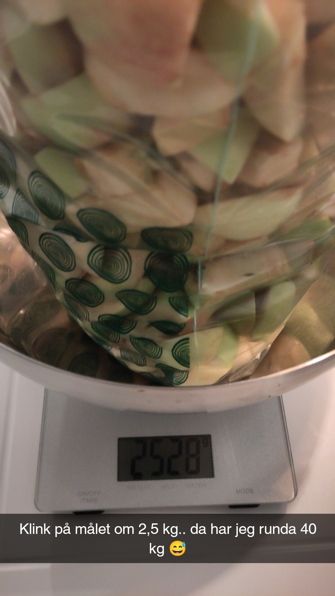 23 kg eple ferdig kuttet og lagt i fryseren. Det verste er at jeg nesten er sikker på å ha minst like mye fremdeles i treet. Ooog siden dette er nedfallsfrukt, har jeg sannsynligvis kastet ihvertfall 10 kg med avskjær hittil, meget mulig at det er mer.