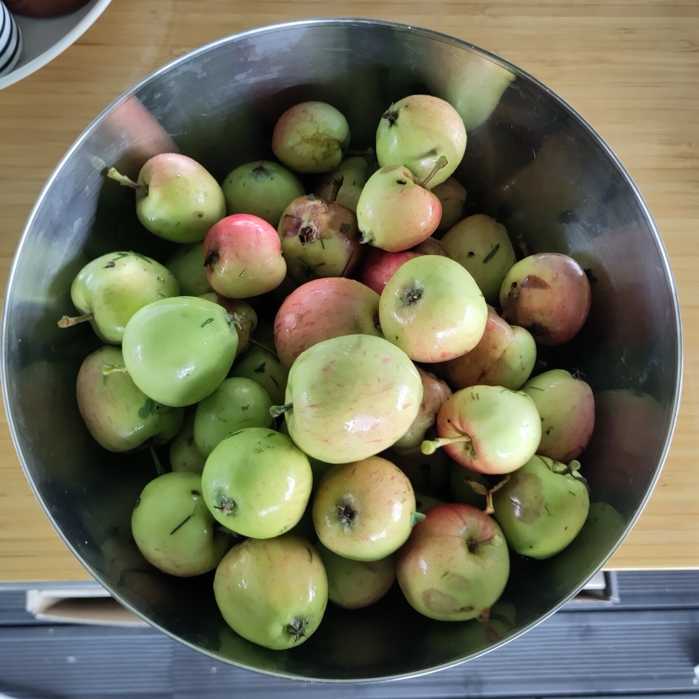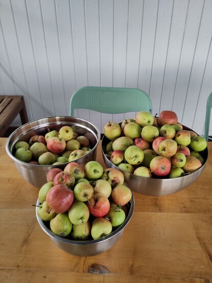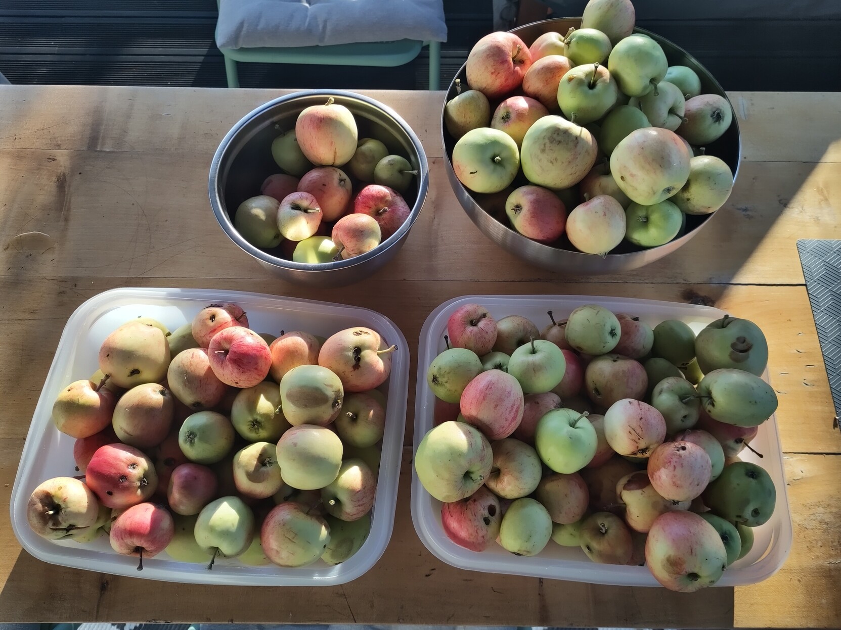 Forøvrig har sanking av nedfallsfrukt hittil gitt 10,3 kg epler i fryseren. Fremdeles har jeg såpass mye liggende på vent at jeg helt sikkert kan legge til enda 3 kg (minst!) til totalen. Og fremdeles er treet fullt av epler!