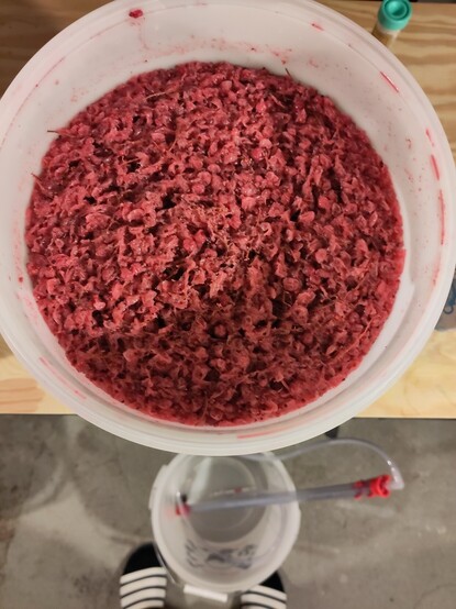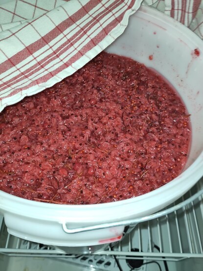 Blandet sammen 4,7 liter knuste bær med 8 liter vann, 1,5 kg sukker og en klunk gjærnæring på søndag. Vinen røres tre ganger daglig, og står i varmeskap stilt inn på 19 grader, siden kjelleren er kald. Det ser ikke ut som om det skjer noe i karet enda før man rører litt rundt oppi der. Da kommer CO2-boblene frem. Det er bra liv i bøtta nå! En dag eller to til, så stikkes vinen om til et nytt kar, for å bli kvitt bærene, og tilsetting av mer vann og sukker.