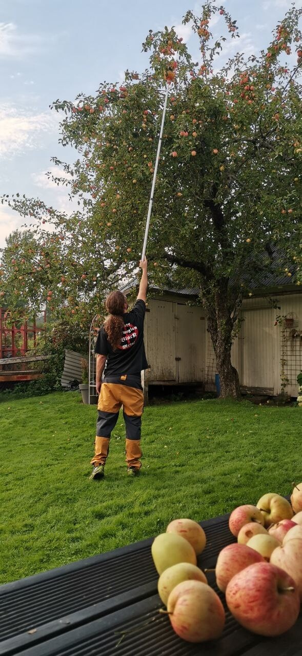 Meg (ca 2.40 med utstrekt arm) + epleplukker ca 2,5-3 m har ikke nubbsjans til å nå de øverste eplene i treet. Neste steg blir å klatre opp på taket til utedassen og garasjen, og ikke minst klatre opp i treet, for å plukke.. er fremdeles kilovis med epler oppi her.