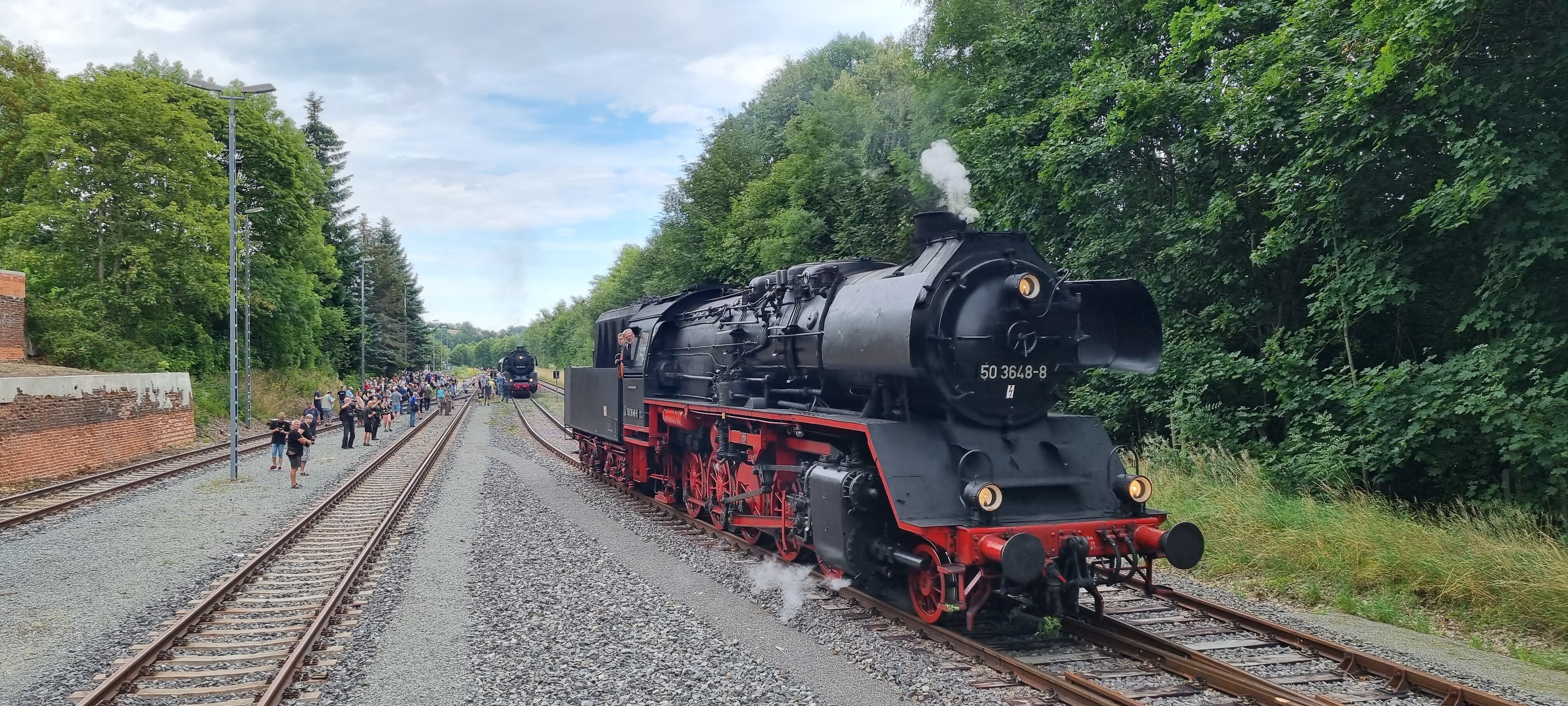 Garantiert brannte in euch schon die Frage, wieviele Loks jetzt an das andere Zugende umsetzen würden, wenn wir schon dekadenterweise und ohne tieferen Sinn mit gleich zwei Dampfloks hier auftauchen. Aber wir wollen ja bescheiden tun, also geht nur die vordere, die 50 3648-8, an's andere Zugende.