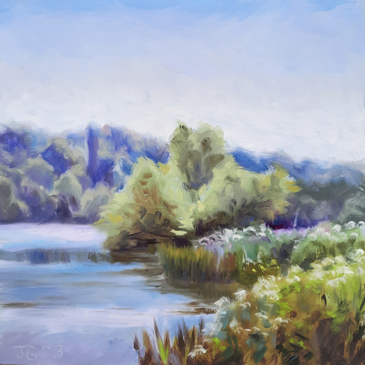 Today's painting was far more easier, not as cold as it was yesterday, but still frosty by the river. Love painting the river when it's like this.