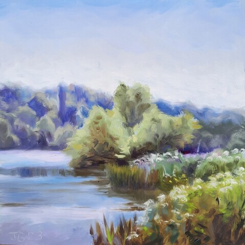 I finished a painting this morning that I started yesterday by the Thames in Henley. Really glad I had my clip on umbrella today which offered me some shade from that relentless sun. Oil on primed panel. 20 x 25 cm.