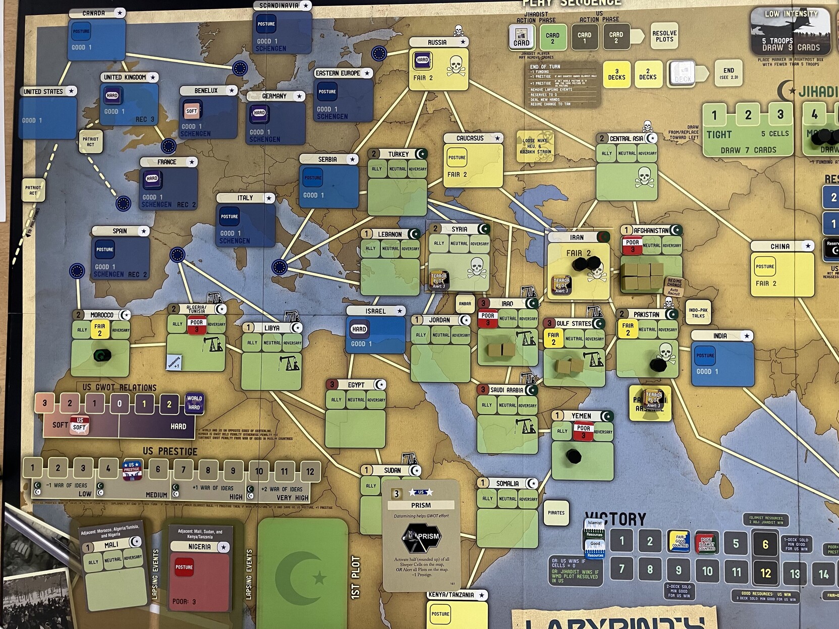 I lost as Terrorist with an automatic defeat by reaching the required resources of Good countries. My fault: I gambled that the US last card will not be enough to raise Irak’s governance level to Good, after I played the infamous Old Spike event. Why risk such scenario? Because it was my last chance to cancel one lasting event that was making me to lost 2 funding points at the end of the turn.