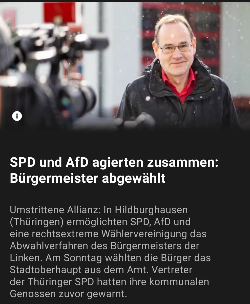 @mtz767 Und weiter geht's in #Hildburghausen... #SPD wählt gemeinsam mit der verfickten #AfD den Bürgermeister ab. 💩