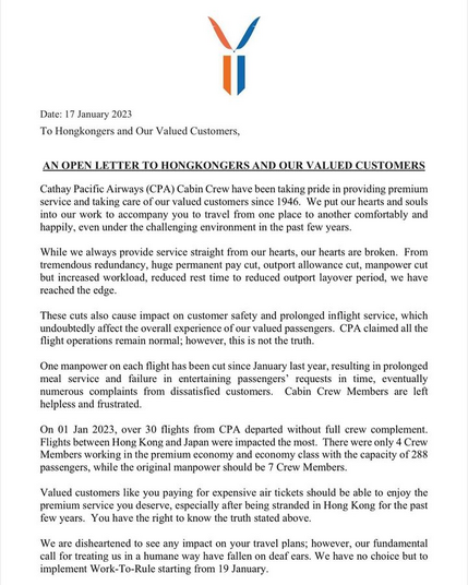 @HKLabourRights RT by @laiyanhoeric: ‼️Cathay Pacific Airways Flight Attendants Union #FAU announced INDUSTRIAL ACTION starting Jan 19 "Our fundamental call for treating us in a humane way have fallen on deaf ears. We have no choice but to implement Work-To-Rule starting from January 19." #HKLabourRights [1] https://nitter.hongkongers.net/HKLabourRights/status/1615354264221614087#m