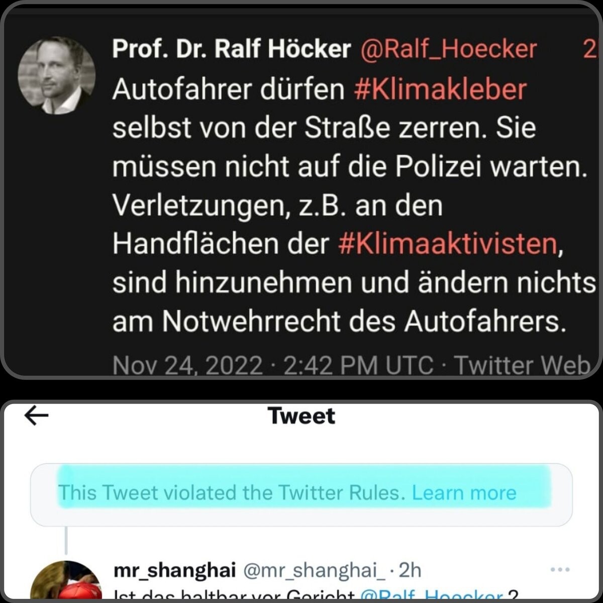 @AufstandLastGen@twitter.com Das kommt halt unter anderem dabei heraus, wenn das Springer-Drecksblatt @WELT@twitter.com einem Anwalt aus dem rechten Spektrum eine Bühne bietet, auf der dieser in einem Video behaupten darf, dass Selbstjustiz gegen @AufstandLastGen@twitter.com gerechtfertigt sei. #Höcker