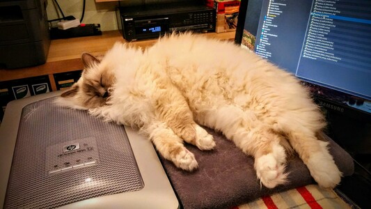 #HolyBirman buddy Emil relaxing on his dedicated desktop spot w/ his butt in general monitor direction, because warm.