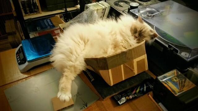 ...so here's an old pic from late 2007 of our young boss man Henry (2006-2018) with fiery red eyes casually lounging cool on the packing table behind the decks, in front of Marco Carolas 1000 collection and Deepchords Grandbend vinyl.