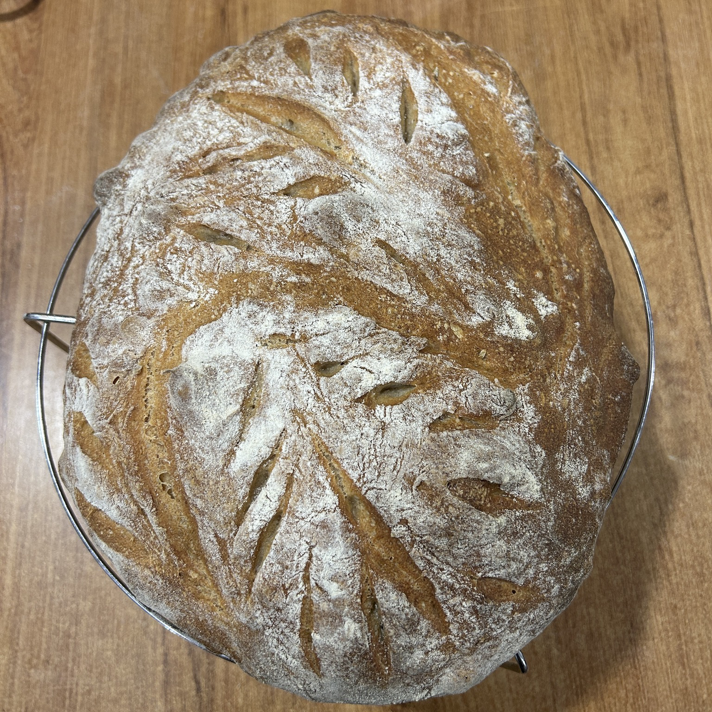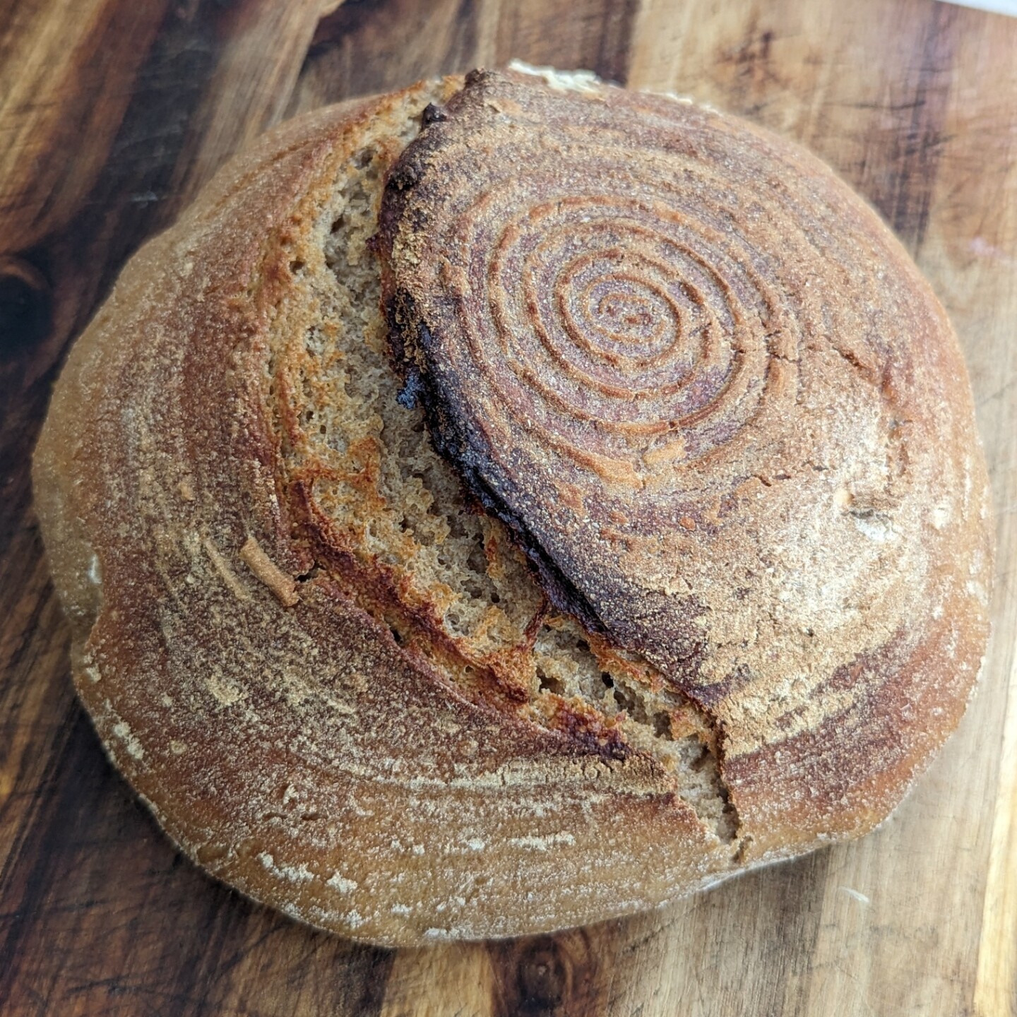 Probably the prettiest sourdough bread I ever baked. It's for giving away, so I won't be able to check the crumb but it looks all right, and it had a proper oven rise, which is a sign of a happy dough.