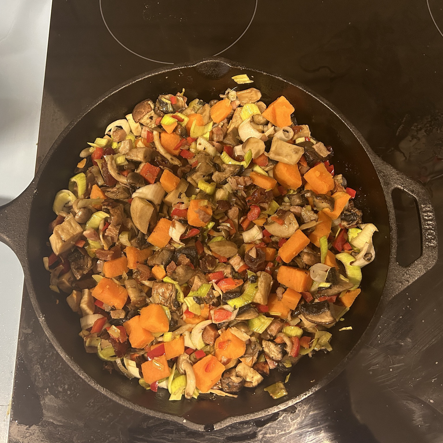 Pic1: the heart of the fillings*. Lots of different types of mushroom, leek, spring onion, sweet potato, bell pepper, rum-soaked fruit, posh bacon.