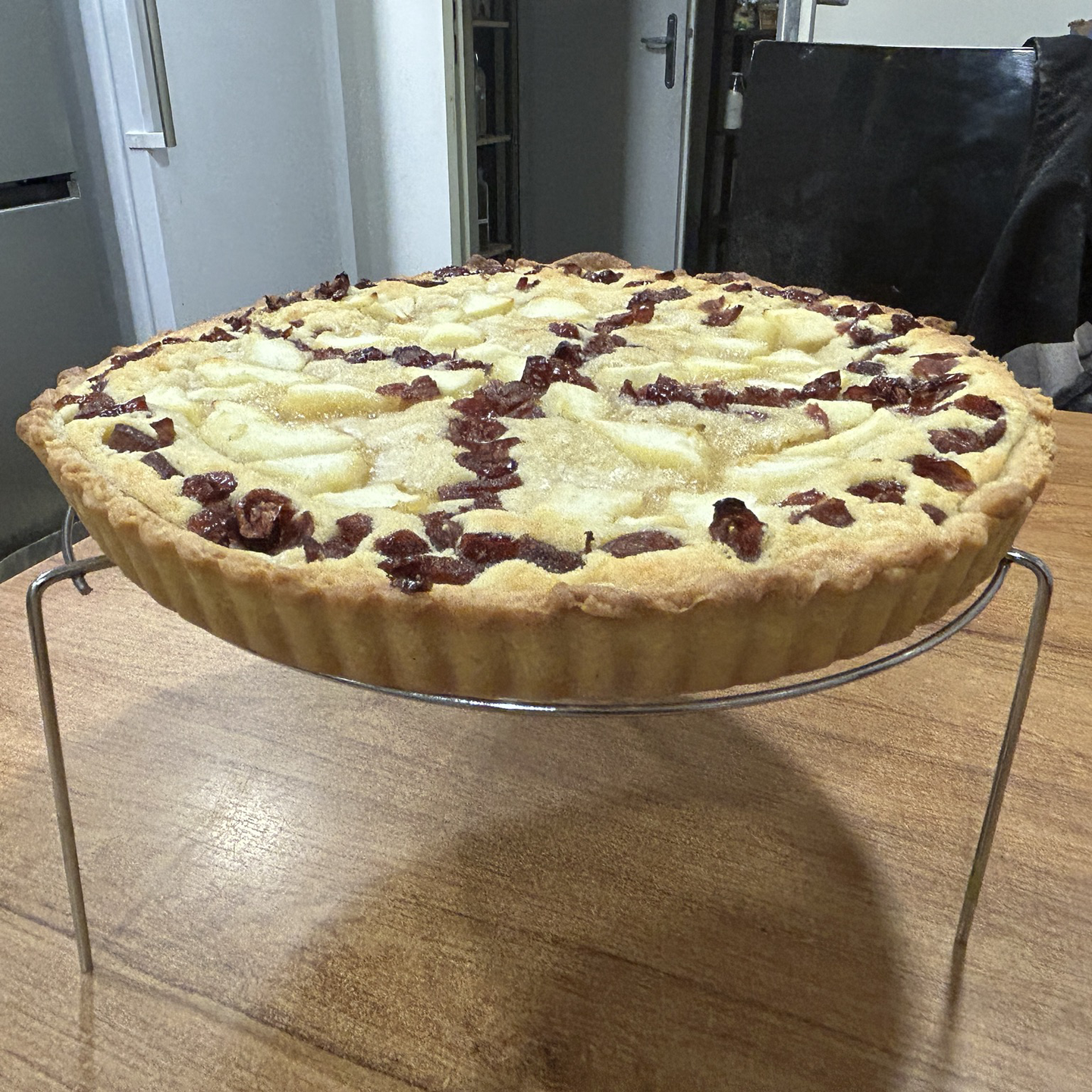 Yesterday I made sweet pastry dough. Today I made almond cream, rolled out the dough, filled a loose-bottomed tin with it and let that rest for 30 minutes in the fridge. (The almond cream had to rest in the fridge for 15 minutes.)