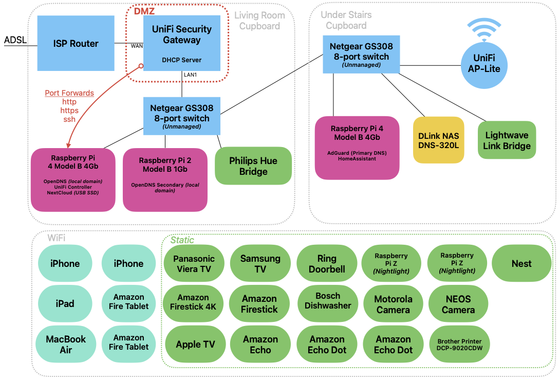 Thought I'd draw out my home network... really ought to have a re-org and split out into different subnets as it's all on the one at the moment (other than the ISP router to USG bit). Help! #HomeNetwork #networking