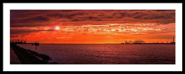 Port of Le Havre, Normandy France sunset, from Honfleur side of the Seine River:
