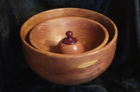 Red cedar. Hollow form has a walnut burl inlay and the top is purple heart.