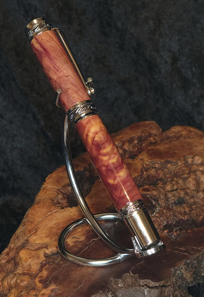 #hotoffthelathe tonight is a Majestic style rollerball pen made from cedar burl. The second photo shows the pen blank before it was cut from the slab. The cap barrel is beautiful in its own right and would be stunning on almost any pen. But the burl in the bottom section makes the cap look bland by comparison.