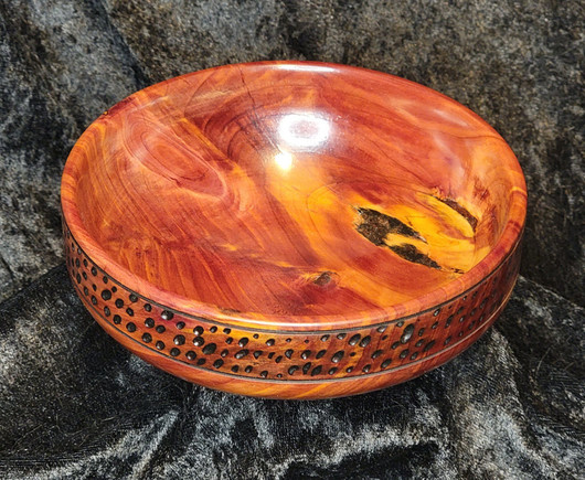 #hotoffthelathe tonight is a turned and carved cedar bowl at 6.25" wide x 2.5" tall. Wife gave me a Master Carver Pro for Christmas which I used to carve out the 1" high band of dimples along the outer rim. This piece is from an outer section of log that grew into itself, leaving the bark inclusion in the bottom right and swirled grain like a burl.