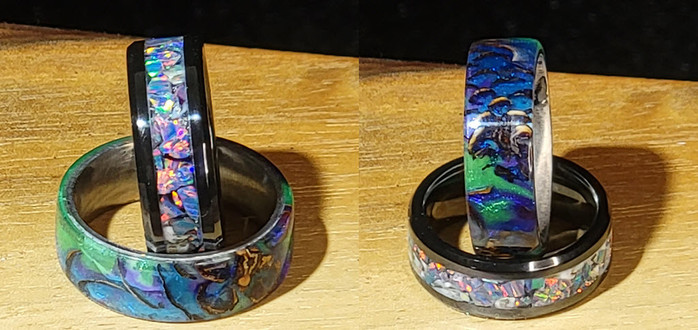 The pine cone ring was for me and for practice. Grandson gets the ceramic core opal inlay ring... which was also for practice. I wanted to make a couple of rings before cutting into the blank he actually picked.