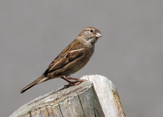 A female house sparrow perching on a tree stump on her way to a neighbour's bird feeder.