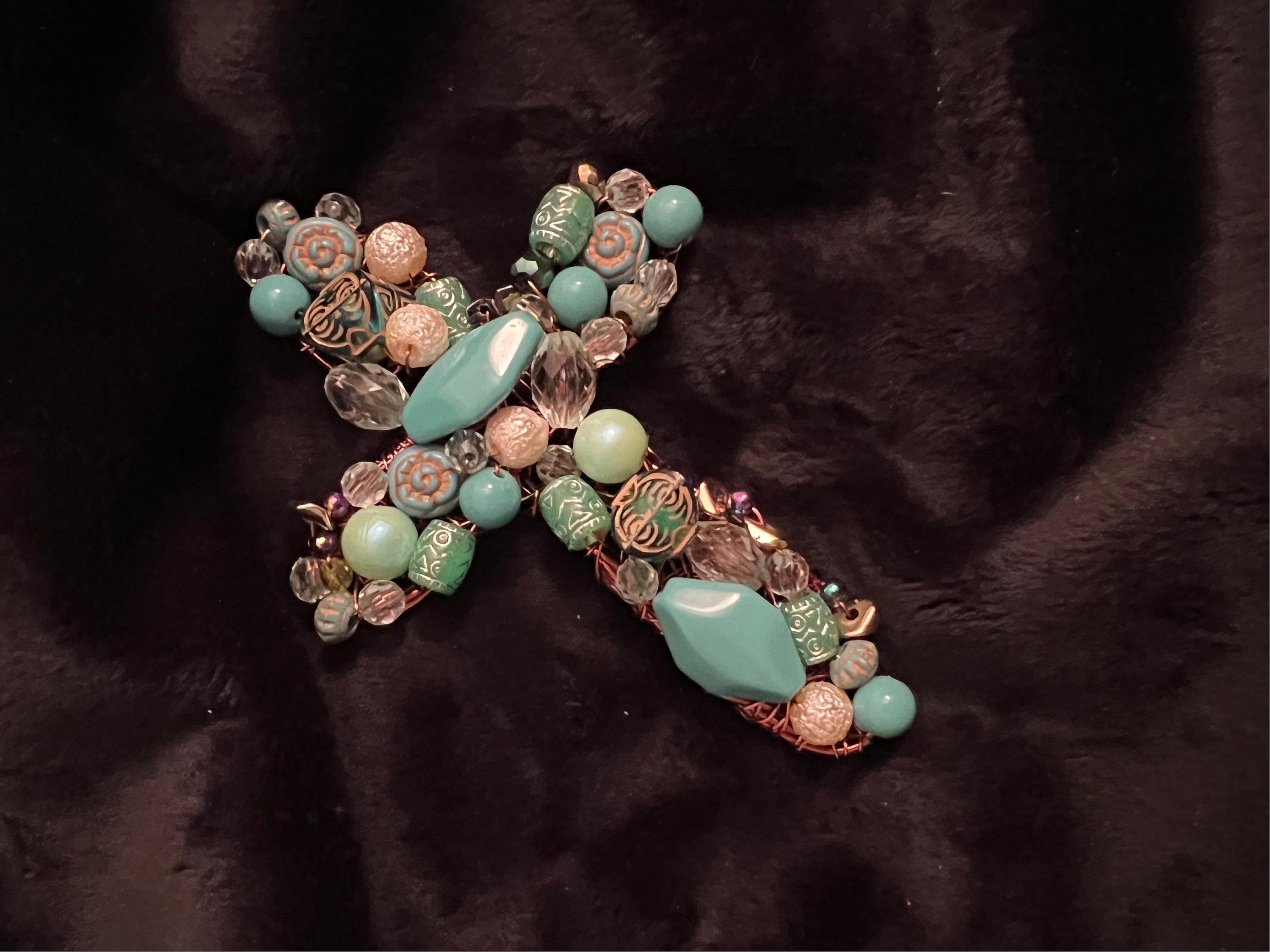 Available now in my #etsy shop: Wisdom in Flight Cross #green #housewarming #beading #blue #bedroom #artdeco #cross #turquoise #feathers https://etsy.me/3lW9j86 https://i.etsystatic.com/41720584/r/il/39e4db/4703745578/il_fullxfull.4703745578_mt37.jpg