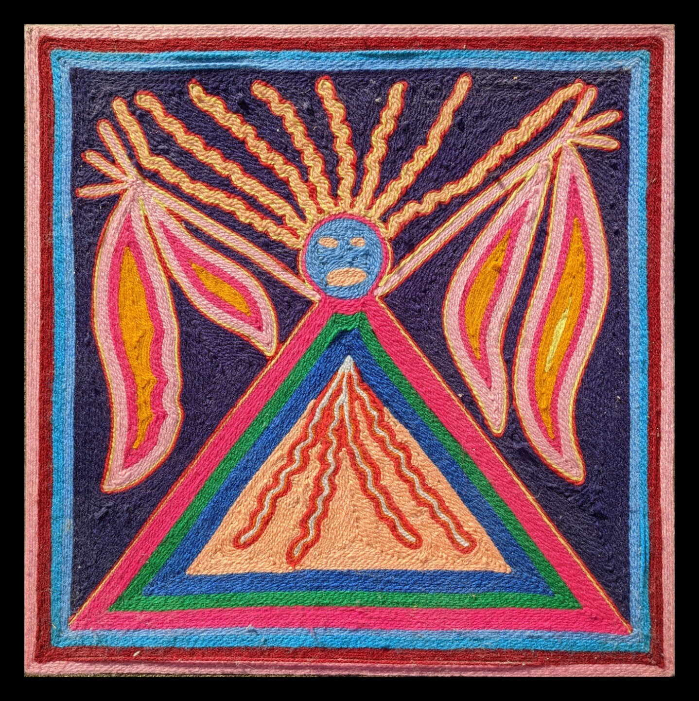 This is Tatewari, the Huichol god of fire. The medium is yarn art, wherein a mixture of beeswax and pine resin is used to coat a surface and then yarn is arranged and pressed into it. Huichol spiritual practices include the consumption of peyote. But maybe that's obvious. This piece belongs to my partner and I photographed it at her request for another endeavor. But I thought y'all might like to see it.