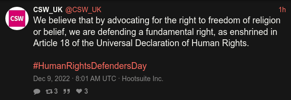 @CSW_UK RT by @benedictrogers: We believe that by advocating for the right to freedom of religion or belief, we are defending a fundamental right, as enshrined in Article 18 of the Universal Declaration of Human Rights. #HumanRightsDefendersDay https://nitter.hongkongers.net/CSW_UK/status/1601124963318218752#m