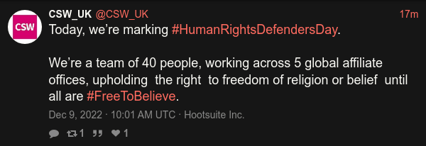 @CSW_UK RT by @benedictrogers: Today, we’re marking #HumanRightsDefendersDay. We’re a team of 40 people, working across 5 global affiliate offices, upholding the right to freedom of religion or belief until all are #FreeToBelieve. https://nitter.hongkongers.net/CSW_UK/status/1601155179344166914#m