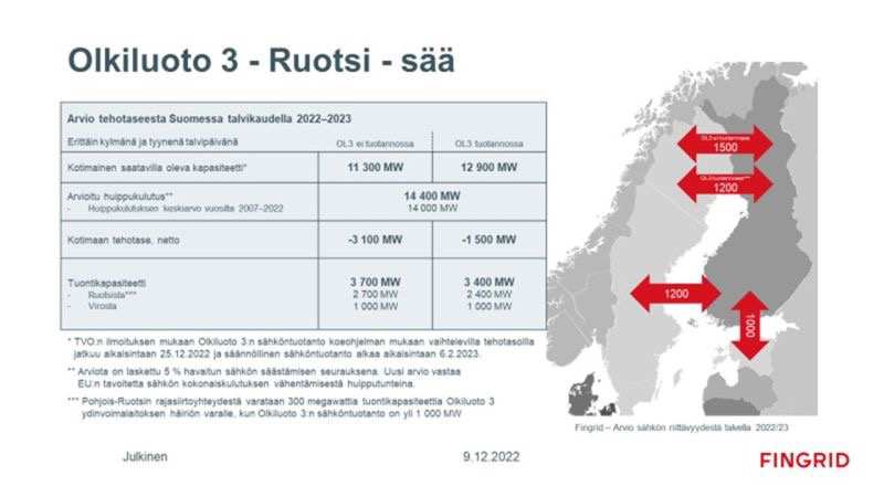 Fingridin arvio talvikauden 2022–2023 sähkön tuotannosta ja kulutuksesta erittäin kylmänä ja tyynenä talvipäivänä. Riski sähköpulaan joutumisesta on kasvanut. Toisaalta ”syksyllä alkanut sähkön säästäminen ja yritysten sekä kuntien vapaaehtoinen sähköjärjestelmän tuki -menetelmä parantavat näkymää talven sähkön riittävyyden kannalta huomattavasti”. #sähkö #energia #huoltovarmuus