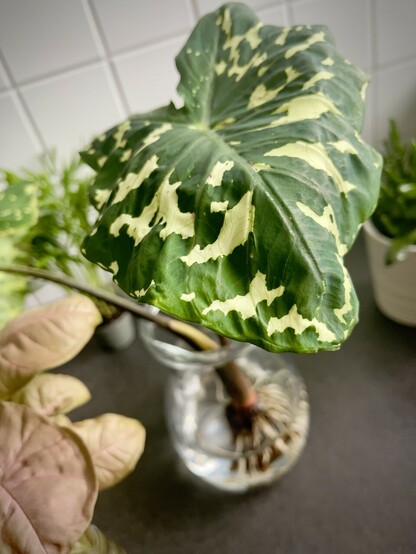 Let's talk about plants, baby: Das hier ist Nr. #104, eine Caladium Praetermissum von der Resterampe des lokalen Gartencenters, ihre welken Blätter schrien geradezu nach Rettungsprojekt. Ich habe sie gestern von ihrem fauligen Wurzelballen getrennt und in Wasser gesetzt, heute Morgen sah sie tatsächlich schon etwas besser aus. Gogogo, kleine Schönheit! 🪴💖 #hyperfixsero #pflanzimheimglückallein #zimmerpflanzen