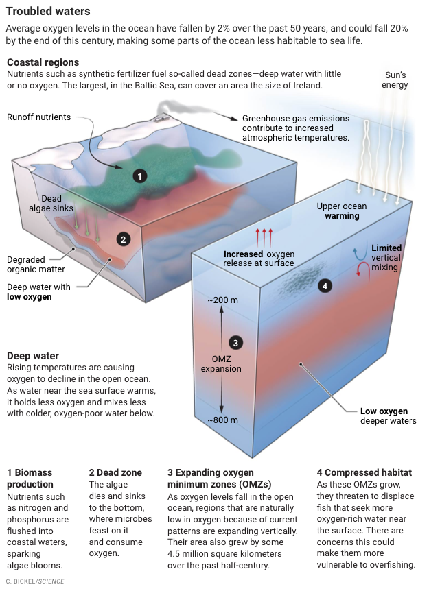 AAAS: "Breathless Oceans" Climate change is leaching oxygen from the ocean by warming surface waters, increasing metabolic rates of fish + crabs, + boosting stratification of warmer surface water, preventing mixing. In higher latitudes, meltwater from ice + snow creates freshwater layers on top of saltwater, also interfering with mixing by waves + wind. "Scientists for yrs have documented oxygen-starved dead zones in places like the Gulf of Mexico and the Baltic Sea." In 2017 a paper in Nature reported the global ocean had 'already lost some 2% of their oxygen since 1960, roughly double what climate models predicted.' Andreas Oschlies, a biogeochemist at the GEOMAR Helmholtz Centre for Ocean Research Kiel notes if the trend continues, it could mean a potential loss of 20% by 2100. Regional variations count. Off the Oregon coast, crabbers in 2002 began pulling up traps full of suffocated crabs, an area 'fed by a deep, oxygen-depleted current from the North Pacific Ocean that wells up near the coast.' Low oxygen levels are routine, but in 2002 scientists found oxygen levels had fallen by 65%. Even if falling oxygen doesn’t kill marine animals, it can interfere with fish hormones crucial to reproduction, stunt growth in young fish, weaken immune systems, and even strike animals blind. Deoxygenation may ultimately be a greater driver of extinctions than acidification + marine heat waves. Time to get serious about climate weirding. #hypoxia #climatechange