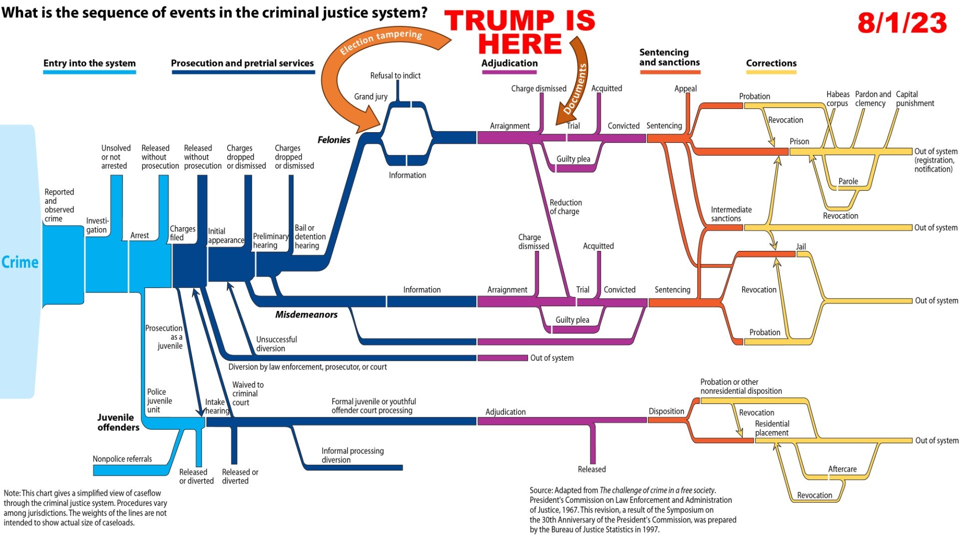 Updated the US criminal justice process map with Trump's two major sets of federal charges -- (a) the violation of US sensitive document laws, and (b) tampering with the 2020 election. If I'm missing any, please let me know. #IANAL #USpolitics