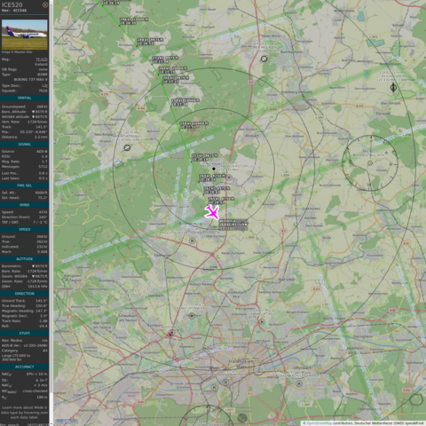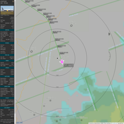 #ICE520 Reg.: TF-ICB ● Type: 737MAX 9 ● Operator: Icelandair ● Route: KEF-FRA Keflavik International Airport to Frankfurt Airport ● is 0.4 km away @ 10668.0 m and 88.1° from horizon, heading SE @ 973.0km/h 11:03:37 (CET). #WayTheHeckUpThere #FlyingFast #AboveGRQ #ADSB #dump1090