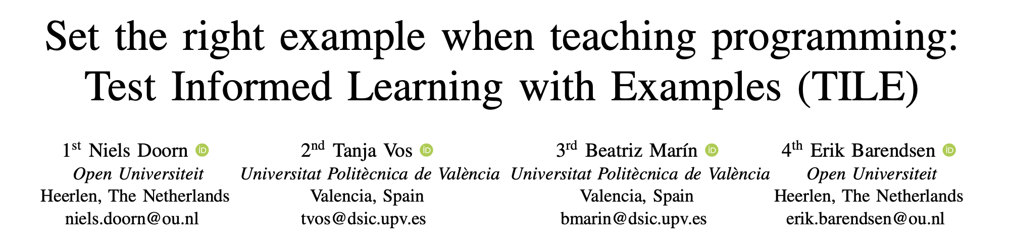 Our paper is titled "Set the right example when teaching programming: Test Informed Learning with Examples (TILE)" and is about introducing Software Tesing in (exisiting) introductory programming courses early, seamless and subtle. It comes with a repository full of exercises in which this approach is applied: https://tile-repository.github.io/