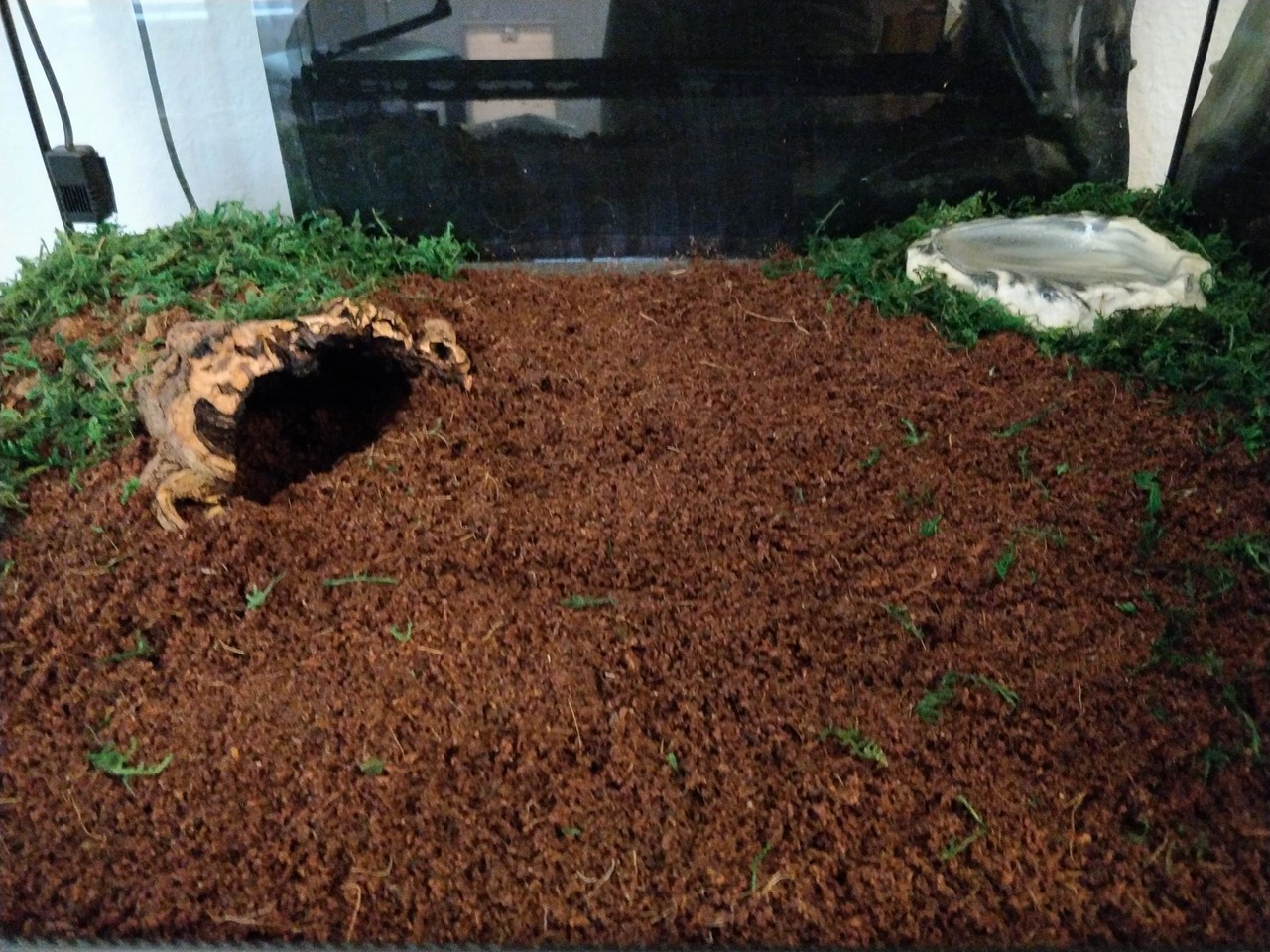 I don't know by what criteria tarantulas judge aesthetics but, from my human perspective, I think Moghedien's revamped enclosure looks cozy.