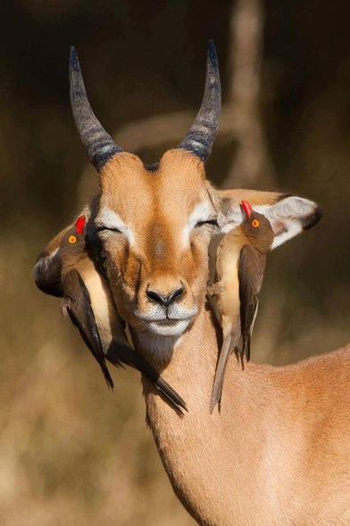Two red-billed oxpecker on either side of an impala’s face. Hanging like earrings. Impala looks blissful.