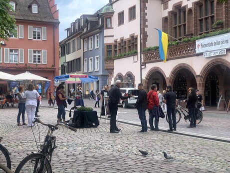 Auf dem Rathausplatz verteilt die #Freiburg|er #Coronaleugner Szene „Infoflyer“ zu angeblichen ⚰️„#Impftoten“ - Passanten nehmen die Flyer entweder nicht an oder werden sie gleich weg.