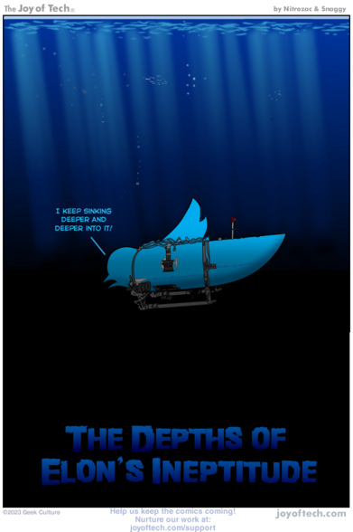 "How low can Twitter sink?" by @joyoftech comic - What is the crush depth of that submersible? #implosion #RIPTwitter #SocialMedia #WTF #oops