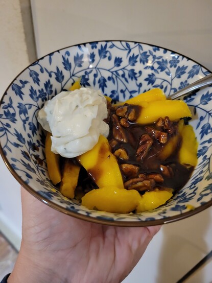 Leaving town for Origins Game Fair in the morning and I had Good Food that was going to go to waste if I didn't act. And so we had mangoes with a brown sugar-butter-pecan sauce, flambéed with smoked maple bourbon and topped with honey-thyme crème fraîche for dessert.