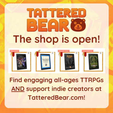 We have digital copies of all-ages TTRPGs that are not only great for families and classes but that support indie creators and future Tattered Bear projects.