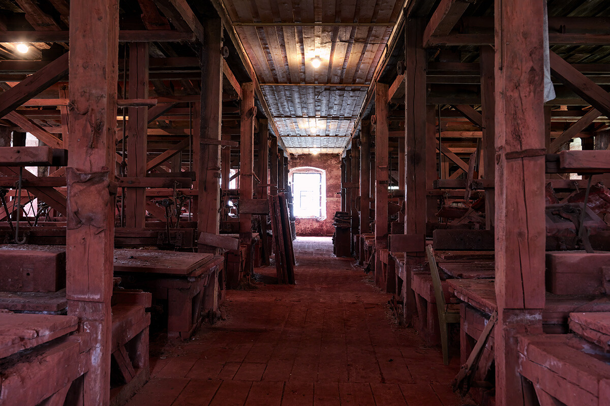 Letztes Wochenende habe ich eine alte Glasschleiferei besucht. Das Rot stammt vom Eisenoxid das als Schleifmittel verwendet wurde