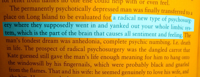 “Over half the admits to psych wards are things like cheerleaders who swallow two bottles of Mydol over a high-school breakup or gray lonely asexual depressing people rendered inconsolable by the death of a pet.”