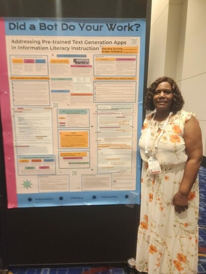 My poster is at @ALAAC23 without me! Thanks to Sandra Echols for presenting our work "Did a bot do your work? Addressing pre-trained text generation apps in information literacy instruction" (she just sent me this pic)