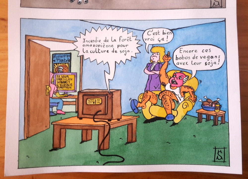 Lisez bien les bulles, mais aussi l'écran d'ordinateur, et le poster dans la chambre du jeune homme