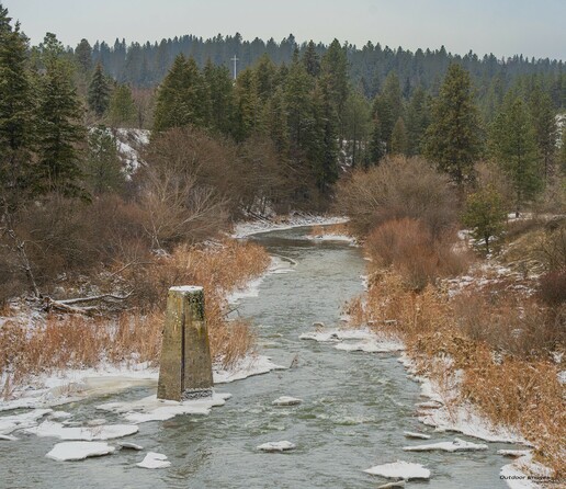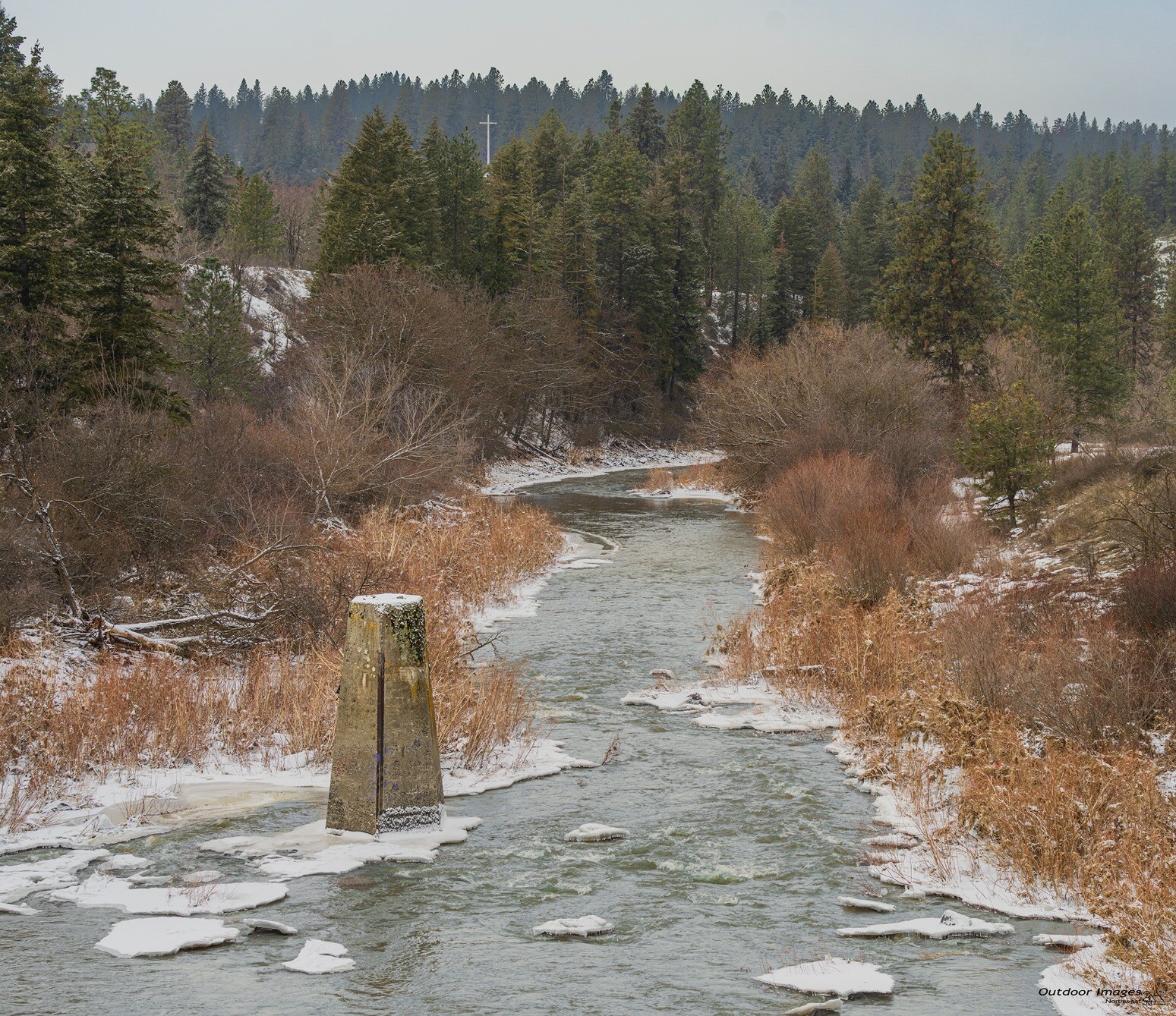 HANGMAN CREEK begins its journey in northern Idaho and meanders approx 70 miles NW through eastern Washington until it flows into the Spokane River about a half mile downstream from this photo. In the foreground is the remains of a long forgotten bridge support.