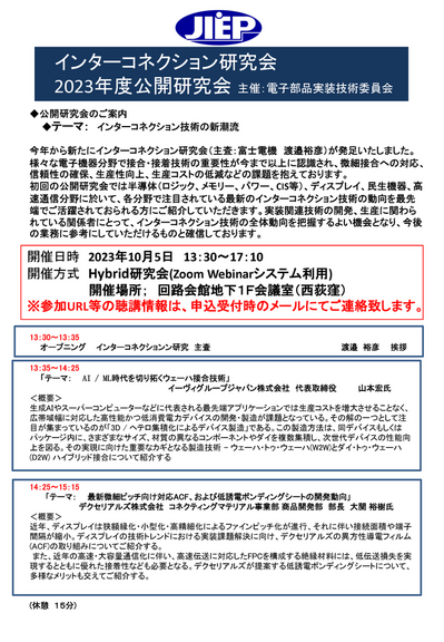 10月5日13:30-17:10に、エレクトロニクス実装学会 #JIEP 電子部品実装技術委員会がインターコネクション研究会2023年度公開研究会を開催。テーマは『インターコネクション技術の新潮流』、講演4件。東京都杉並区・回路会館およびオンラインにて。詳細は https://jiep.or.jp/tech-committees/pdf/20231005.pdf に。