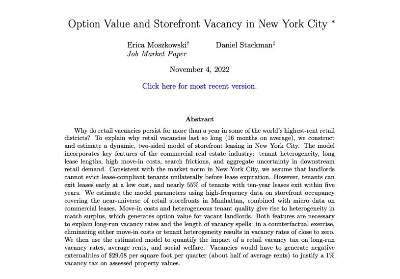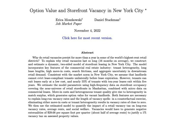 “Option Value and Storefront Vacancy in NYC.” Erica Moszkowski @emoszkow & Daniel Stackman https://emoszkowski.github.io/ericamoszkowski.com/Moszkowski_JMP.pdf