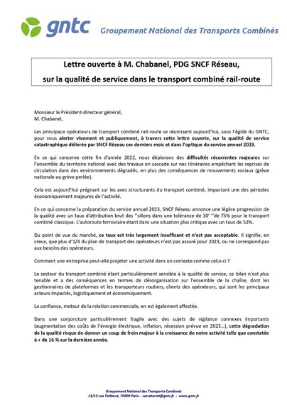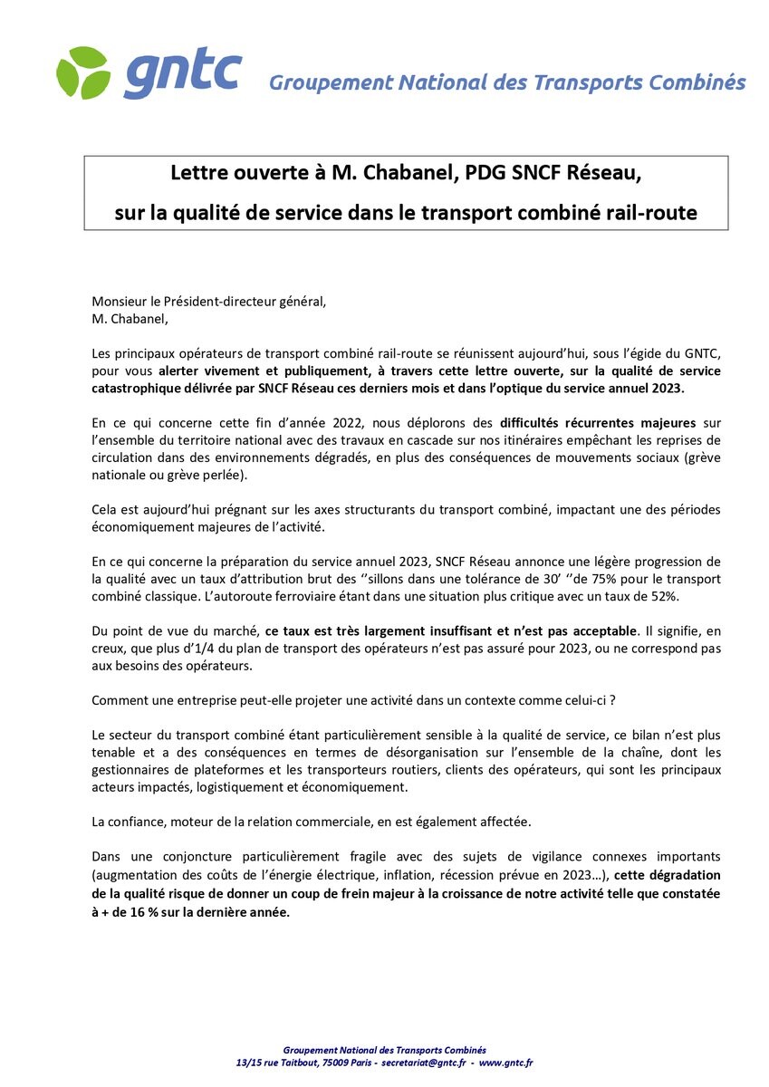 👉 [Communiqué de Presse] Lettre ouverte du GNTC à M. Chabanel, PDG @SNCFReseau@twitter.com sur la qualité de service délivrée aux opérateurs de transport combiné fin 2022 et pour 2023. #intermodalité #transport #fret