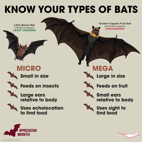 Very roughly, bats are divided into megabat and microbat categories. Megabats are bigger, tend to have bigger eyes and fox-like faces, and mostly eat fruit. Microbats have smaller eyes, more complex noses and ear shapes, and mostly eat insects!